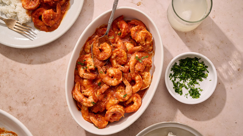 A la diabla is the Spanish phrase for "of the devil," referring to food that is extremely hot (and red, usually). Named after the infamously evil pitchfork-wielding bad guy, dishes by this name are a combination of spicy ingredients simmered with tomato that leave a lasting heat dancing on your tastebuds well after the meal has ended. Shrimp is the perfect protein for this saucy dish, and this recipe written with Michelle McGlinn combines the juicy shellfish with three different kinds of chiles for a heat that is smoky, sharp, and lingering all at once. The dish isn't hard to prepare, either, coming together in less than 30 minutes for a weeknight meal that is devilishly good.
