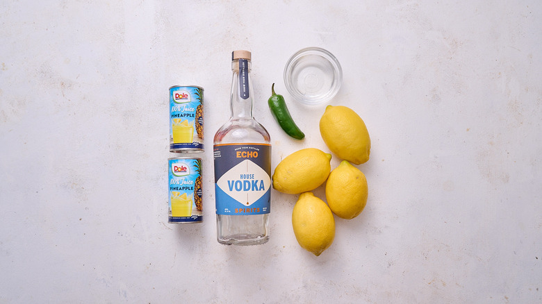To infuse the vodka, you'll just need a jalapeño and vodka. You can use any vodka here, and we recommend using one you enjoy — but not one you'd hate to lose to a flavor infusion (so avoid your top-shelf). From there, you'll want lemons for fresh lemon juice, pineapple juice (this is usually canned), and simple syrup. For a simple garnish, use a slice of jalapeño or lemon. For a little extra heat, grab some Tajín to line the rim.