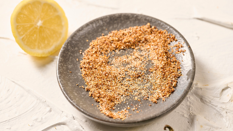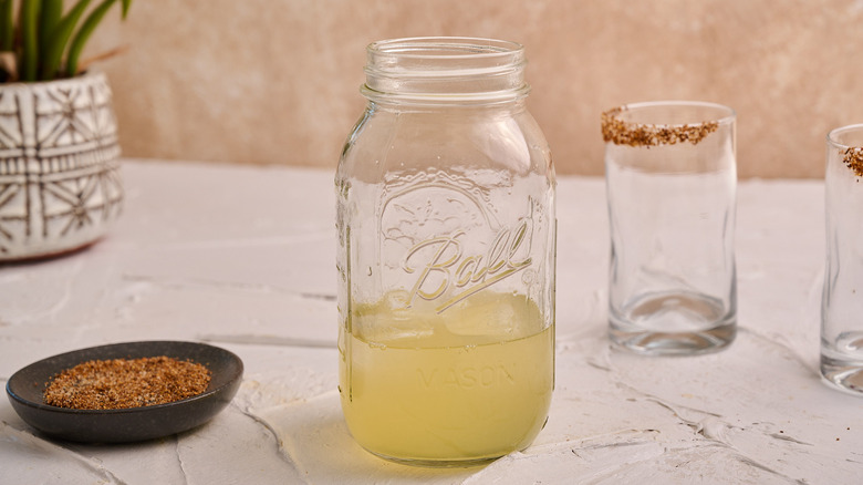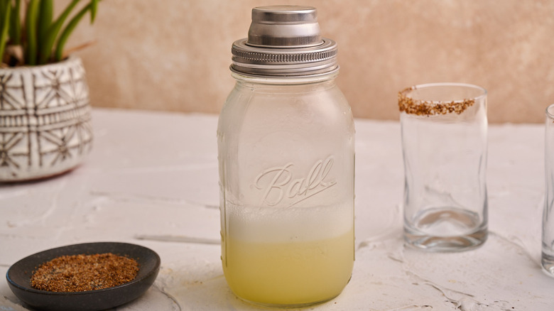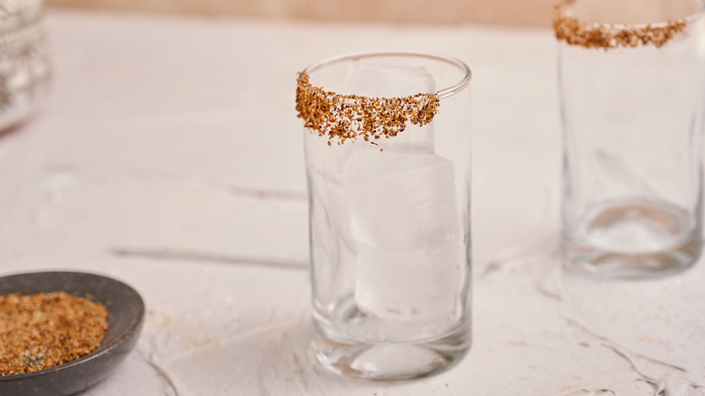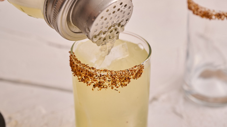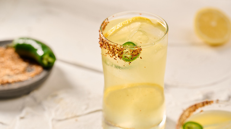 Tajin is a blend of dried red chiles, lime, and salt, which results in a uniquely tangy spicy blend. It's the primary seasoning on a dish like elotes — or street corn — and pairs well with everything from corn to fruit salad. In fact, it's often shaken on fresh fruit, and its zingy heat brings out the juicy sweetness of slices of mango, apple, orange, or watermelon. That's why it's especially great with spicy lemonade, adding an extra layer of spice and a little bit more tang. If you don't like the sour taste of Tajín, though, there are other salts – and sugars — to add flavor to your cocktail's rim.