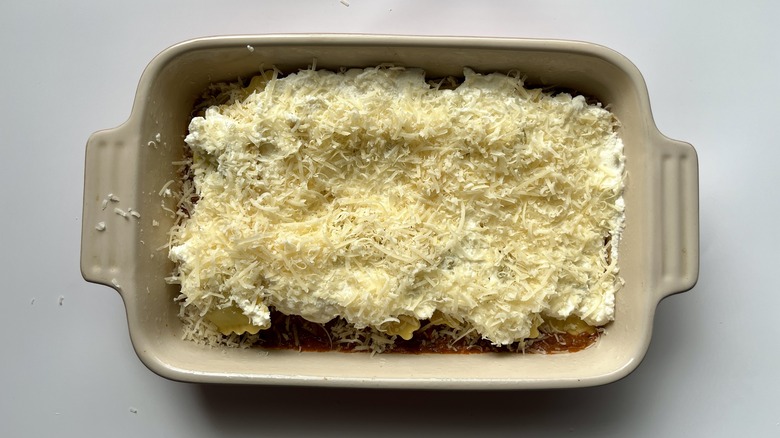 - Spread all the ricotta and 1 cup of Parmesan over the ravioli.
