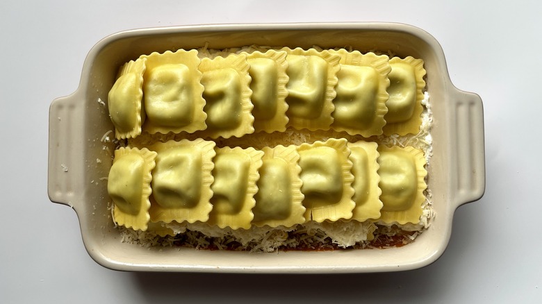 Step 9: Layer half the ravioli
