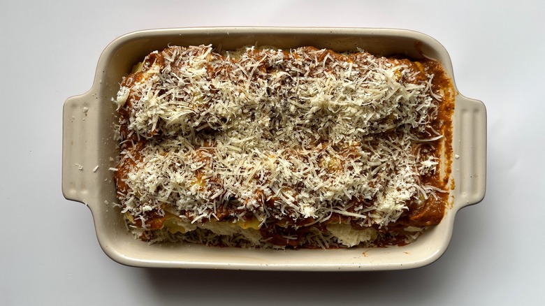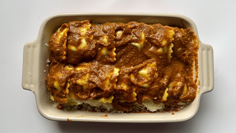 Whether using fresh, frozen, or store-bought ravioli, Le Moing recommends using half-moon-shaped ravioli because they have more surface area. This makes it easier to arrange the pasta in the baking dish and spread even layers of tomato sauce and ricotta. Triangular and circular shapes also work well. If using square-shaped ravioli, Le Moing suggests overlapping the pointed ends (like diamonds) instead of the flat square-shaped ends.