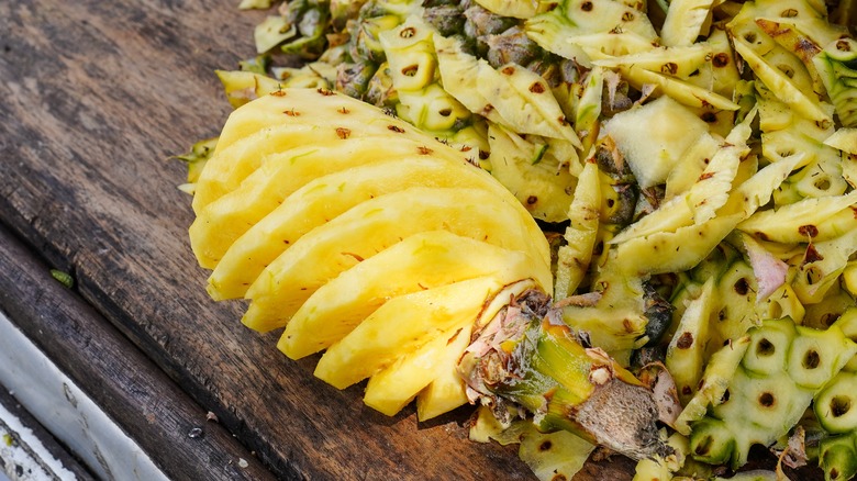 Once the rind and eyes are removed, you can use the serrated knife to easily carve out the core and slice your pineapple into chunks, slices, or wedges. From there, pineapple possibilities abound, but if you're looking for inspiration, we're partial to our bacon-wrapped pineapple recipe made for Hawaiian pizza lovers and our pineapple teriyaki chicken recipe, an easy weeknight go-to that's deeply fragrant and bursting with flavor.