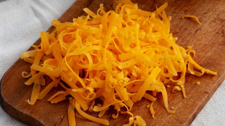 The best way to incorporate cheddar, according to Serrano-Bahri, is to finely grate a block of the cheese. That way, there's an even distribution in the eggs, and the evenly-sized shreds all melt consistently. For the same reasons we avoid using pre-grated cheese on pastas, we recommend using freshly grated cheese for your eggs to ensure a better melt and fresher flavor. Serrano-Bahri prefers to add cheddar cheese halfway through the cooking process so there's enough time for a slow melt.