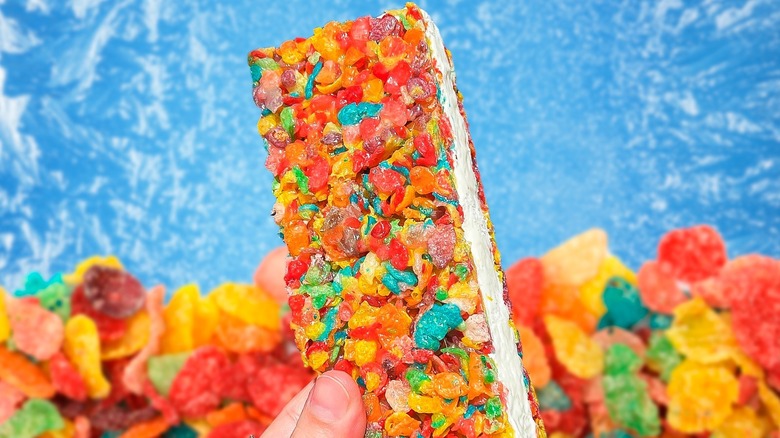 Simply use your favorite breakfast cereal to make marshmallow cereal bar treats, then grab two cereal bars and stuff 'em with a scoop of ice cream, sandwich-style. To assemble the cereal treats, simply melt butter, mini marshmallows, and a little vanilla extract (or use store-bought jarred marshmallow fluff) over low heat in a saucepan or pot. Then, stir your dry cereal into the melty marshmallow mixture until thoroughly coated. Spread the sticky cereal onto a parchment-paper-lined baking sheet to cool and harden, pressing down to flatten. Once they're fully cooled, you can slice 'em into bars, or lean into the "ice cream sandwich" motif and cut out cereal treat circles using a cookie cutter.