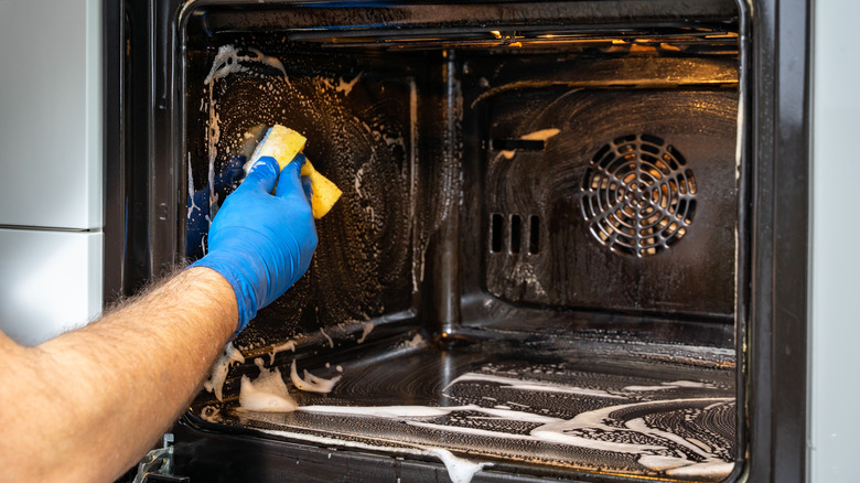 After preheating the oven, you will, of course, need to wait for it to cool down before you actually get in there to start scrubbing. The process of preheating and cooling lets condensation form on the inside of the appliance, which will also aid in softening and loosening the buildup on the walls and floor of the oven. Just keep in mind that you'll want to keep the door closed while it cools down to let the liquids develop. Once the oven is cool enough, you can open the door, apply your preferred cleaning solution, and start wiping down the interior using a whole lot less elbow grease than you would have before.