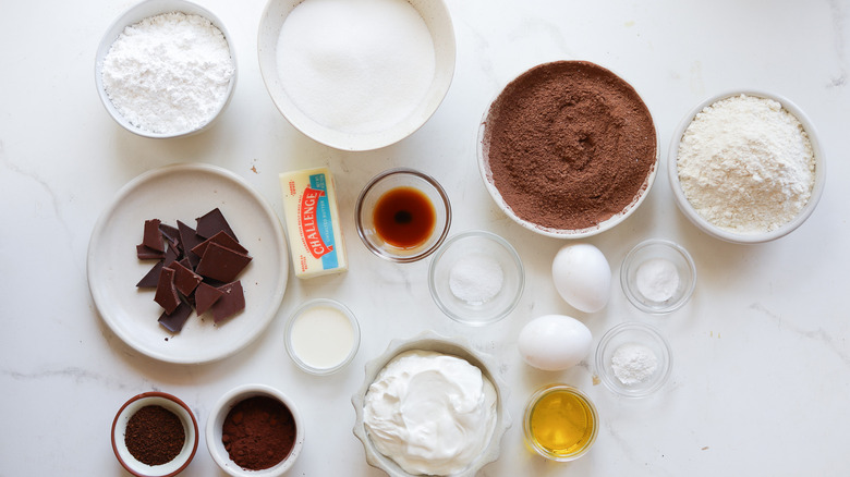The basic ingredients for the chocolate olive oil cake aren't that different from any other chocolate cake. The dry ingredients include flour, sugar, baking powder, baking soda, salt, and cocoa powder. This recipe uses Dutch-process cocoa powder that has been treated to lower the acidity and has a smoother, richer flavor than alternative options. "I prefer to use the best quality cocoa powder I can find for recipes like this that rely so heavily on the flavor of the chocolate, like Valrhona or Guittard," says Murray. The cake also gets moisture from tangy sour cream, eggs, and a hint of vanilla, plus the namesake olive oil. If you can, opt for a high-quality olive oil meant for eating raw instead of cooking in a pan.