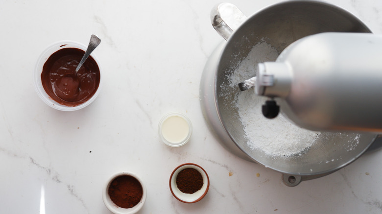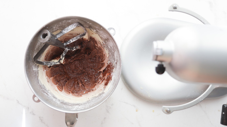 - Add cocoa powder, instant espresso, and heavy cream, and continue to beat until fully incorporated.