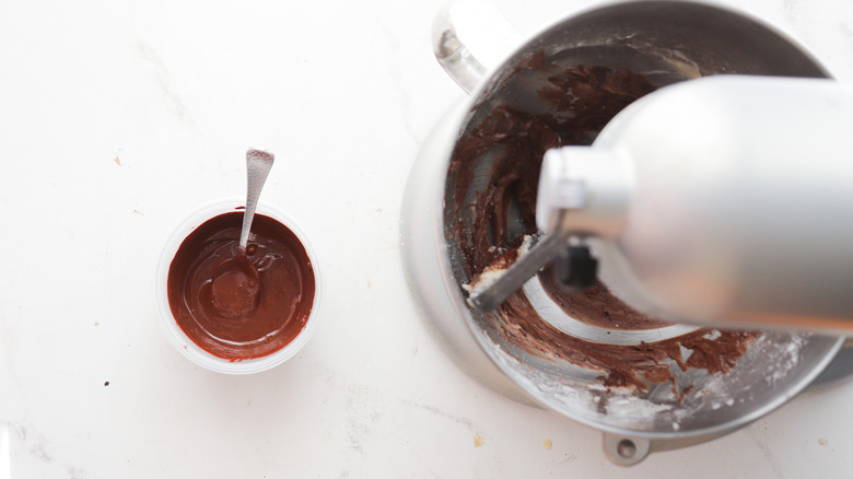 - Slowly drizzle in melted chocolate with the mixer running.