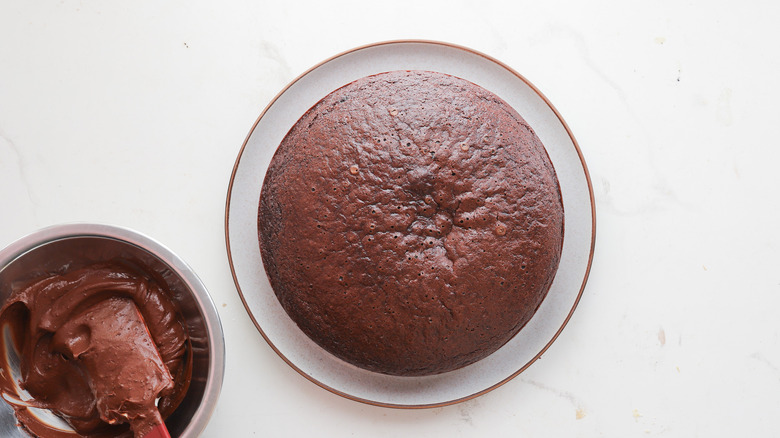 Spread the frosting on the cooled chocolate cake.