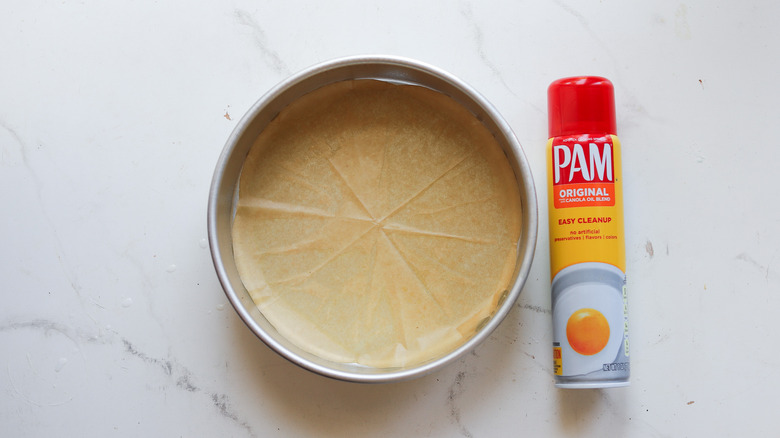 - Prepare a 9-inch round cake pan by spraying it with nonstick spray and lining it with parchment paper.