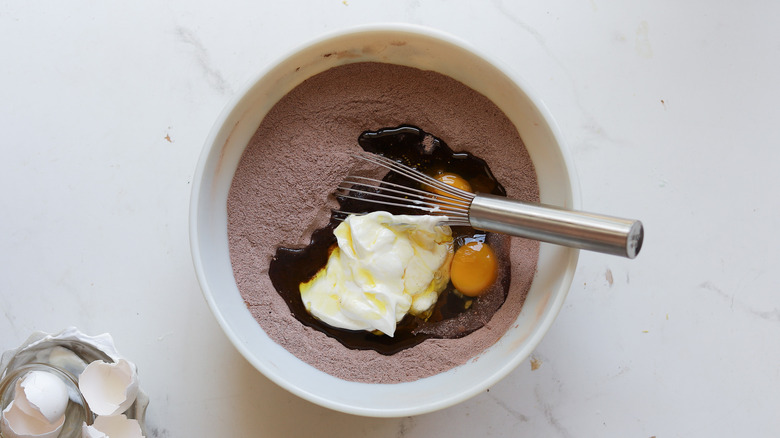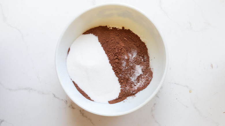 - In a large bowl, whisk together the flour, sugar, cocoa, baking powder, baking soda, and salt.