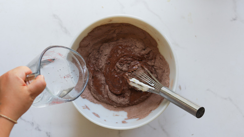 - Whisk in hot tap water, ¼ cup at a time, until the batter is thick and ribbons, about ½ cup total.
