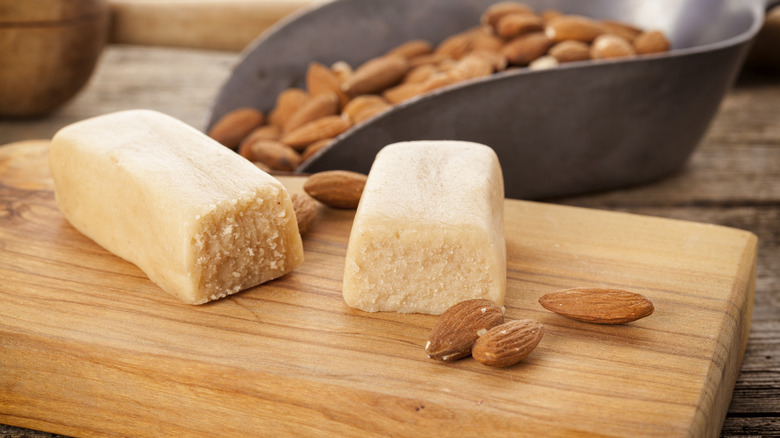 If you're after a sweet snack but are still looking to keep things light and avoid added sugar, try transforming leftover almond meal into decadent treat with the help of just one other ingredient: dates. The two ingredients come together swiftly and easily to produce a bar that is remarkably similar to marzipan. This is somewhat unsurprising, given that traditional marzipan is made of finely ground almonds, alongside sugar, corn syrup, and egg whites. Sticky sweet, caramel-like dates act as both a binding agent and natural sweetener that replaces the need for the sweetener and egg whites.