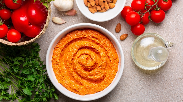 Romesco is a spicy sauce flavored with red peppers, chili, and almonds that originated in Catalonia, Spain. Its vibrant color and punchy taste makes it an attractive and tasty addition to meats and fish. But, it can also be enjoyed as a dip or a suitable pairing for pasta. It's relatively easy to make a smoky romesco sauce at home, and using almond meal in place of whole almonds is one way to reduce the prep time significantly.