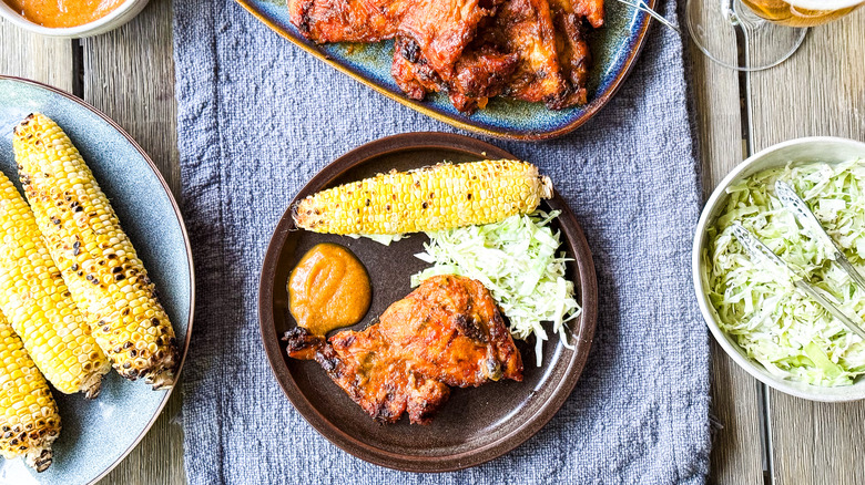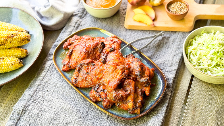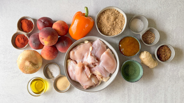 This recipe uses boneless and skinless chicken thighs. Using this cut of chicken makes the meat easy to cut and minimizes flare-ups on the grill from extra skin and fat. You will need chili powder, smoked paprika, garlic powder, kosher salt, and freshly cracked black pepper to create a dry rub for the meat. The BBQ sauce is made from fresh peaches, sweet yellow onion, and orange bell pepper. These items are rubbed with olive oil, then they're grilled to enhance their flavor. The sauce is finished with light brown sugar, peach preserves, champagne vinegar, whole-grain mustard, fresh ginger root, and dried coriander seeds. All of these ingredients are pureed and cooked down into a thick and flavorful sauce.