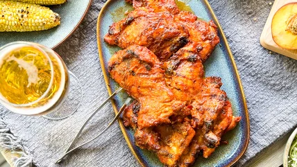 Please a whole crowd with this riff on BBQ chicken thighs, which includes charred peaches, peppers, and onions in its tangy sauce for a unique, summery flavor.