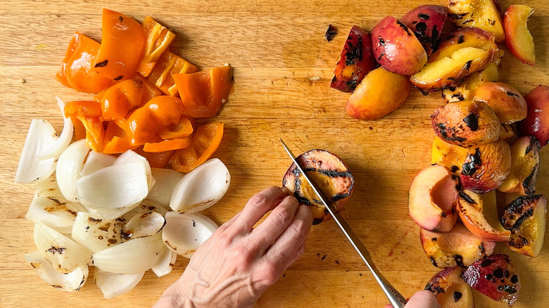 Place the peaches, onion, and bell pepper on the grill.