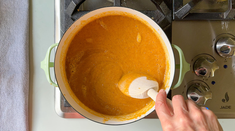 Pour the sauce into a large sauce pot and bring to a simmer.