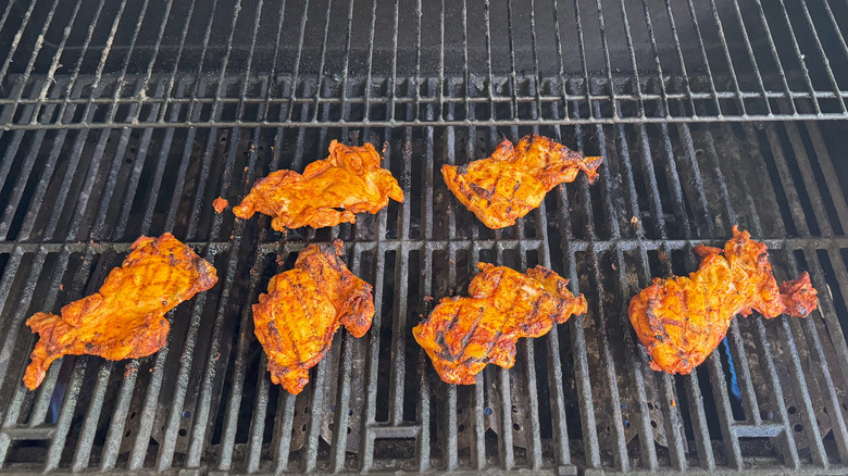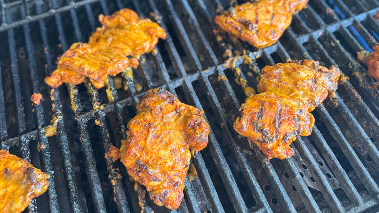 - Add the seasoned chicken thighs to the grill and cook for 5 minutes on both sides.