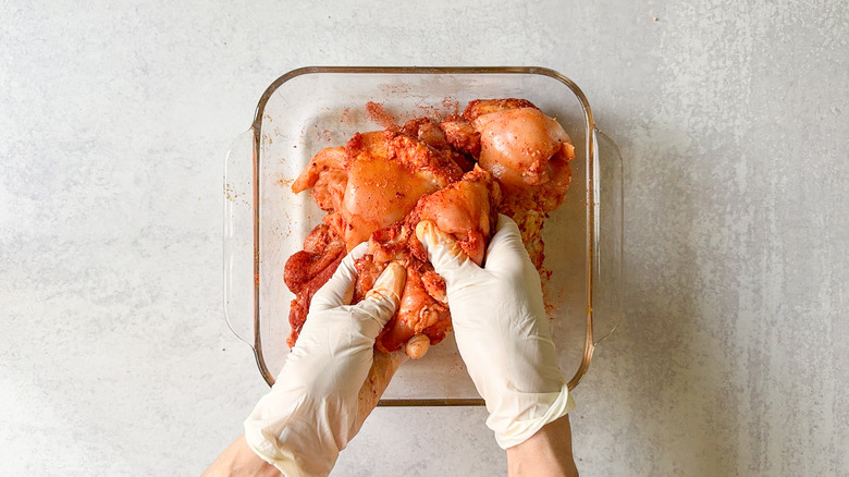 - Place the chicken thighs in a shallow dish or bowl and add the spice mix, rubbing it into the flesh.
