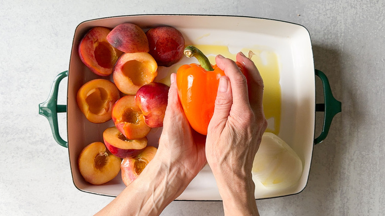 - Place the peaches, onion, and bell pepper in a shallow dish and rub with the olive oil.