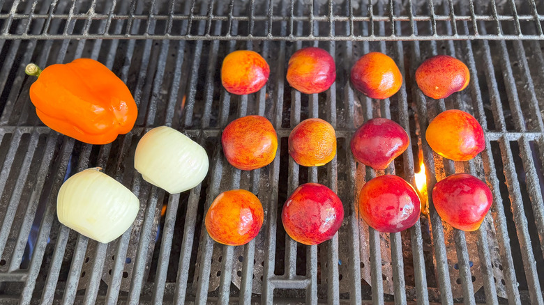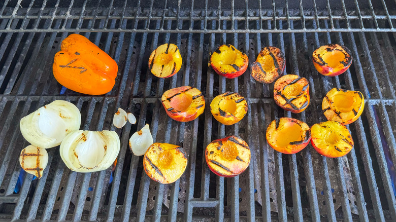 Step 7: Place the peaches, pepper, and onion on the grill