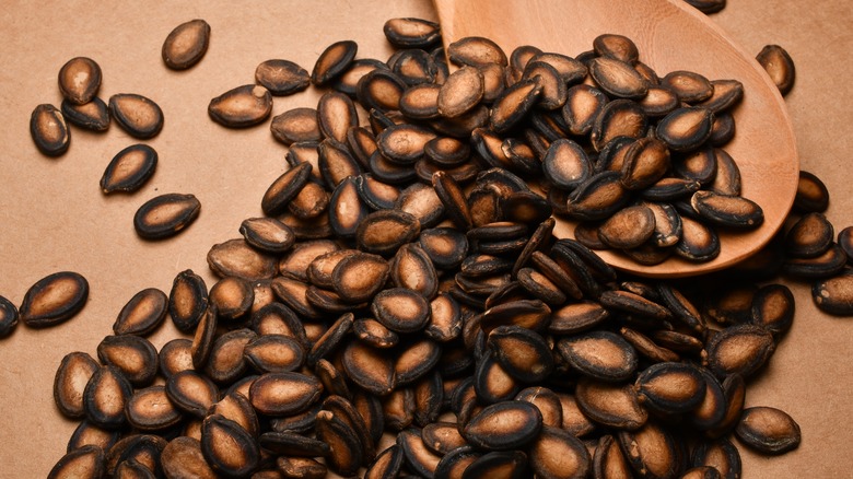 Watermelon seeds get a bad rap. When you're snacking on this refreshing fruit, you're either spitting them out or shopping for seedless watermelon in the first place. If you're using your fruit to make a spicy watermelon cocktail or a watermelon lemonade, you're definitely removing those seeds first. But don't throw them away — they can become a tasty treat on their own if you roast them just like you would do with pumpkin seeds. Watermelon seeds taste a bit like popcorn kernels. There's concentrated crunch with a nutty, caramelly flavor.