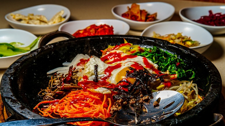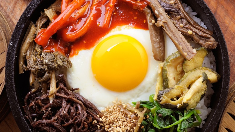 The Korean dish with the fun name is also one of the most popular among Americans. We love bibimbap, maybe because of our penchant for things in bowls, or possibly because we can't get enough of the flavors that are intrinsic to Korean cuisine. Traditional bibimbap is a combination of steamed white rice, vegetables (spinach, soy bean sprouts, carrots, and bell peppers), toasted sesame oil, gochujang (Korean red chili paste), and a sunny side up egg.