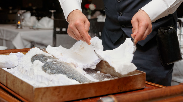 Chefs are willing to use pounds and pounds of salt to salt-bake foods knowing the salt will get discarded — one of the few times a seasoning is purposely bought just to throw away — and that's because of the amazing result of the technique for both taste and texture. Delicate meats like fish or a whole chicken encased in salt crust will steam to juicy perfection while the crust traps all the flavors inside. Nothing is lost to escaping steam or watered down in poaching liquid, and any aromatics stuffed inside the fish like lemon or herbs are also concentrated.