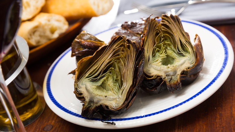 An artichoke is a thistle with delicious meaty hearts. They are packed with nutrients, and might help lower blood sugar levels. Artichokes can be daunting to those who haven't cooked them before, but don't fear. They can be enjoyed with just a few prep steps. A grilled artichokes recipe calls for trimming and boiling them before placing them on the barbecue, adding a bit of char to the soft interior. That charred flavor amplifies the creamy texture of the artichoke flesh. Charring a lemon and squeezing the juice over the artichoke adds a final pop of brightness to this dish.