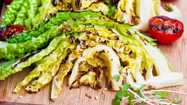 A classic salad staple, romaine lettuce is rich in vitamins A and K, and is often eaten raw; it tastes great when chopped and served in an everyday salad with herby lemon vinaigrette. Nonetheless, romaine also shines when cooked. Cutting a head of romaine in half, drizzling it with olive oil and vinegar, and tossing it on the grill makes for a flavorful and healthy side dish. The lettuce develops a char on some bits, and wilting on others. However, you should eat grilled romaine right after it's cooked, and top it with your favorite dressing or freshly grated Parmesan.