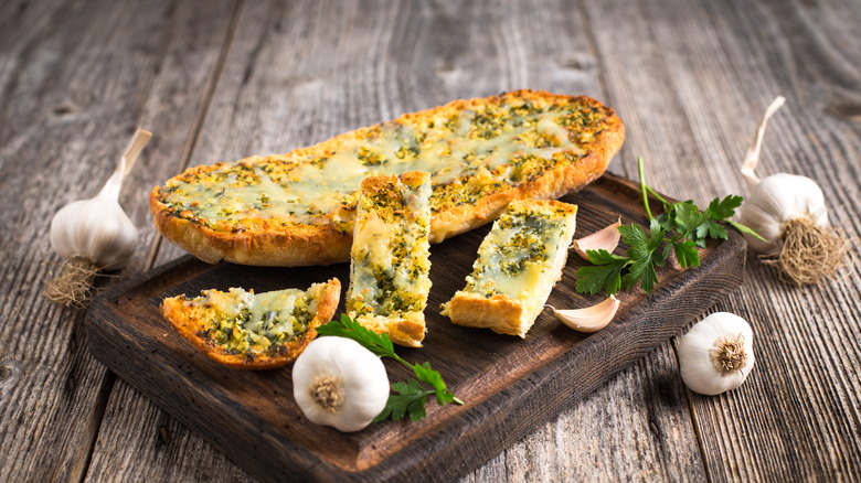 Garlic bread is always a fan favorite, and it gets eaten almost as fast as it's done cooking. Savory roasted garlic and melty butter are a match made in heaven, but the bread is just as important as the garlicky topping. Properly crisping the bread creates a necessary contrast to the softness of the butter and garlic. A flavorful way to get that crusty crunch is to make grilled garlic bread with a drizzle of olive oil. The bread picks up those char marks beautifully, and the smokiness adds a new layer that can't be achieved by oven-roasting.