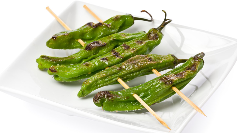 Shishito peppers are generally mild, although occasionally you'll bite into one that has a kick of spice. Slightly sweet and slightly spicy, shishitos are often served blistered, a cooking technique that calls for placing vegetables on a hot surface and leaving them alone until their heat-exposed exteriors bubble and blacken, while their interiors remain deliciously fresh and crunchy. For an outdoor variation of a simple blistered shishito peppers recipe, try using a heated grill, after skewering the pods to keep them from slipping between grates. Once blistered, squeeze fresh citrus over the peppers to further bring out their flavor.