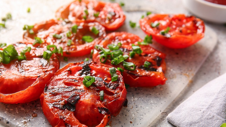 When they are in season during summertime, tomatoes are incredibly vibrant and flavorful, making this the perfect time to grab some for the grill. Tomatoes are incredibly versatile in that they can be eaten raw, cooked down into a sauce, or roasted. Heirlooms are great in salads or sliced and seasoned, but firmer tomatoes like romas are commonly used in sauce. A great way to taste the full flavors of tomatoes like heirlooms and romas is to grill them. Halve the tomatoes or cut them into very thick slices, and sear them on the grill — this will allow for their tangy, juicy flavors to shine.
