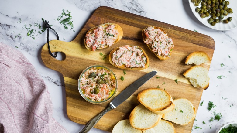 Perhaps the most common way to enjoy pâté is as an appetizer. You've likely seen it served with toast points or crusty bread, or as a featured item on a cheese and charcuterie board. Its rich, creamy flavor pairs wonderfully with crunchy cornichons or a zesty stone ground mustard. Add a bit of pâté to your favorite salad for an easy protein boost, or spread a thick layer on slices of bread next time you make your favorite sandwich. It also makes a decadent dip for chopped or sliced veggies — and if you're feeling bold, you can even stuff peppers with pâté for an unexpected side dish. There are numerous other creative uses for pâté ranging from adding it to scrambled eggs to mixing it into softened butter for an amazing compound butter.