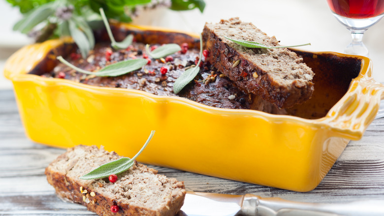 In its simplest form, pâté is essentially a meatloaf that's traditionally made by taking the ground meat and other aforementioned ingredients and packing this mixture into a terrine or pastry dough. Once molded, it's then wrapped tightly in caul fat — the thin, white lining of an animal's internal organs — and baked in the oven until cooked through.