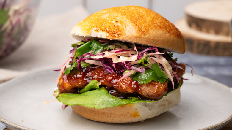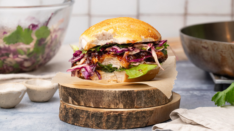 Sandwiches are one of life's great joys, and with so many versions found throughout a wide variety of cuisines, there truly is a sandwich out there for everyone. Though different countries may have different ideas of what precisely constitutes a sandwich vs a burger, it is fundamentally accepted that a sandwich is simply ready-to-eat food such as meats or cheeses served between two slices of bread. There's no reason that a sandwich can't be as hearty, layered, and complexly flavored as a good burger. With that in mind, let us introduce you to this teriyaki chicken sandwich with Asian-inspired slaw, created by Tasting Table recipe developer Jennine Rye.
