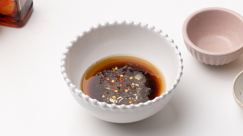 - In a bowl, combine the sesame oil, honey, rice wine vinegar, soy sauce, lime juice, ¼ teaspoon garlic powder, and chile flakes to make a dressing.
