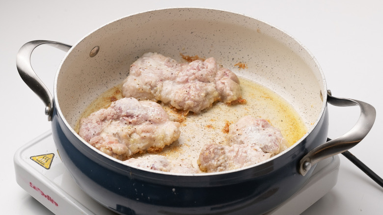 - Transfer the freshly coated chicken thighs straight to the hot pan.