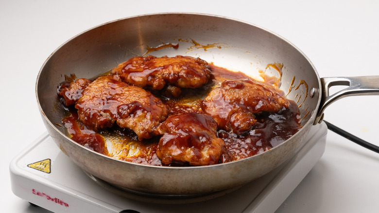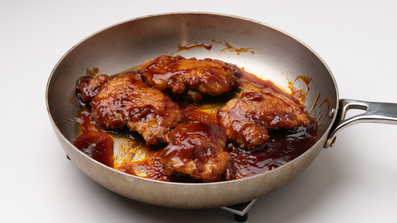 When the chicken is cooked, pour the teriyaki sauce into a clean pan and smother the chicken thighs with it.