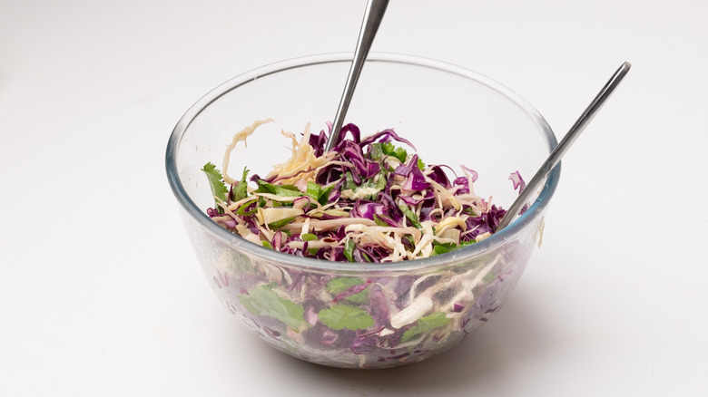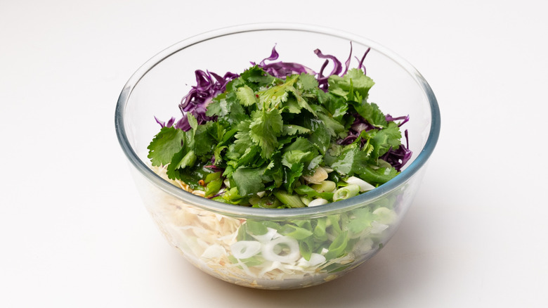 - In a large bowl, add the red cabbage, white cabbage, scallions, cilantro, and dressing.