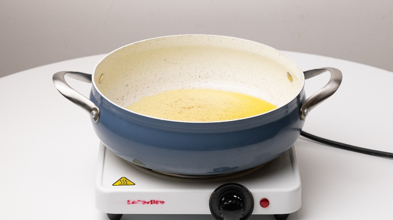 - Meanwhile, heat the frying oil in a large pan over a medium temperature.