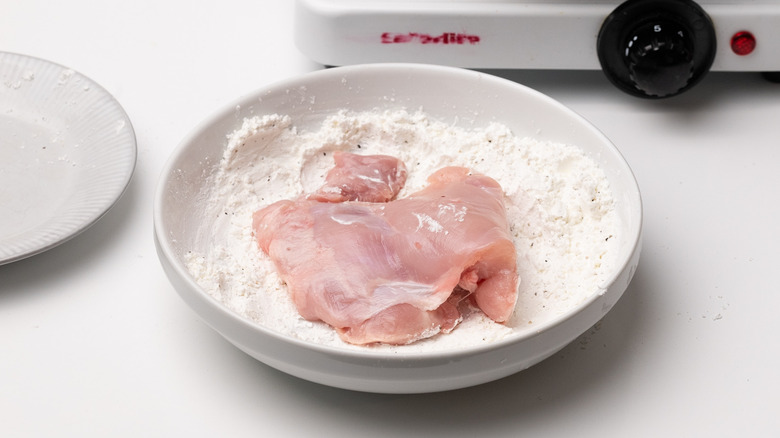 - When the oil has reached temperature, toss the chicken thighs one at a time into the cornstarch until fully coated.