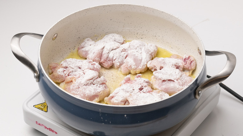 Transfer the freshly coated chicken thighs straight to the hot pan.