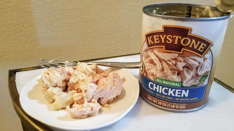 The idea of canned chicken is still a head-scratcher for many. Those new to it may, understandably, confuse its appearance for raw chicken. As we previously covered, a pinkish hue results from a chemical reaction and does not mean that it's undercooked or uncooked. All chicken is pre-cooked before it's canned. The minimum internal temperature to eliminate food-borne bacteria in poultry is 165 degrees Fahrenheit, per the USDA. The chicken will continue to be a bacteria breeding ground otherwise.