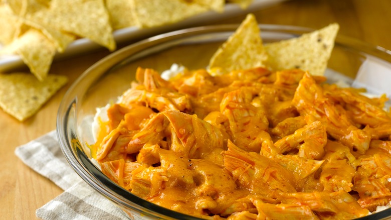 Scouring the internet for ways to use canned chicken, you're bound to find many recommendations for Buffalo chicken dip. Well, we're here to squash that suggestion and save you from a savory sludge. Tangy, spicy, and sweet Buffalo chicken dip is a classic snack-time condiment. It's also more suited to fresh chicken than canned. Texture plays an important part and canned chicken is typically too tender for slow oven cooking. Unlike rotisserie, its silken structure simply doesn't sustain well. As it breaks apart, it develops a grainy, mealy consistency that can result in an unpleasant mouthfeel.