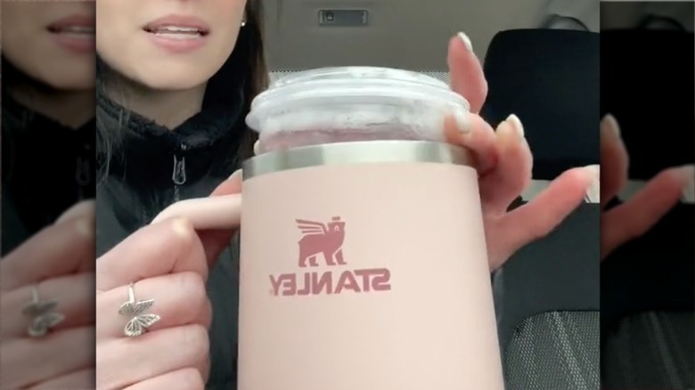 As noted, this hack has pinballed around social media, so there are lots of takes from fans. Most find that this obviously helps keep the Starbucks beverage cold longer. One TikTok user even said that by sliding her drink into her Stanley tumbler, she can leave it in her car in the harsh Arizona heat and return to find that the ice hasn't even melted. But don't just go out and try this willy-nilly — when it comes to this hack, one size doesn't fit all. That is to say, this hack only works with Starbucks' venti iced beverage cups and Stanley's 40 ounce Quencher tumbler. Though the 30 ounce Quencher looks similar, you'll be left with a lot of cup sticking out, negating the desired effect.