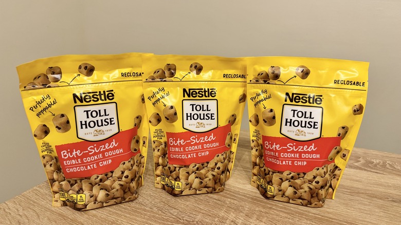 Nestlé Toll House has been making cookie dough since 1939, and it is still a household classic today. The brand's cookie dough bites use the same semi-sweet chocolate chips as the classic Nestlé Toll House chocolate chip cookie recipe. When you open the packaging, the aroma is a mix of sour and sugary, and the cookie dough holds a welcome softness despite being refrigerated.