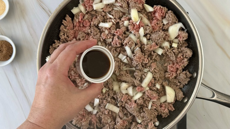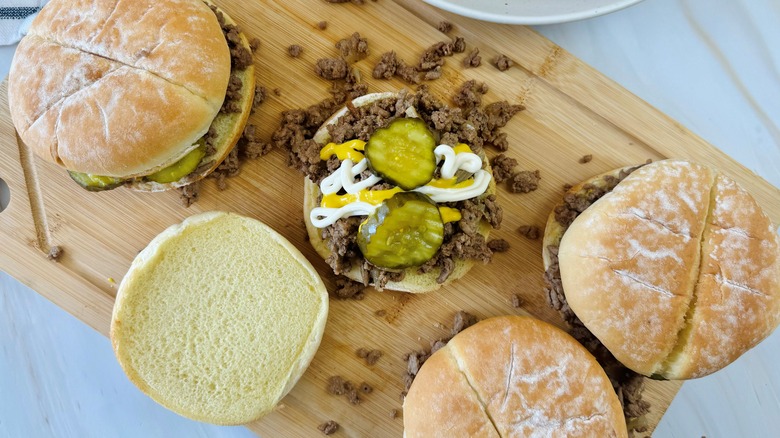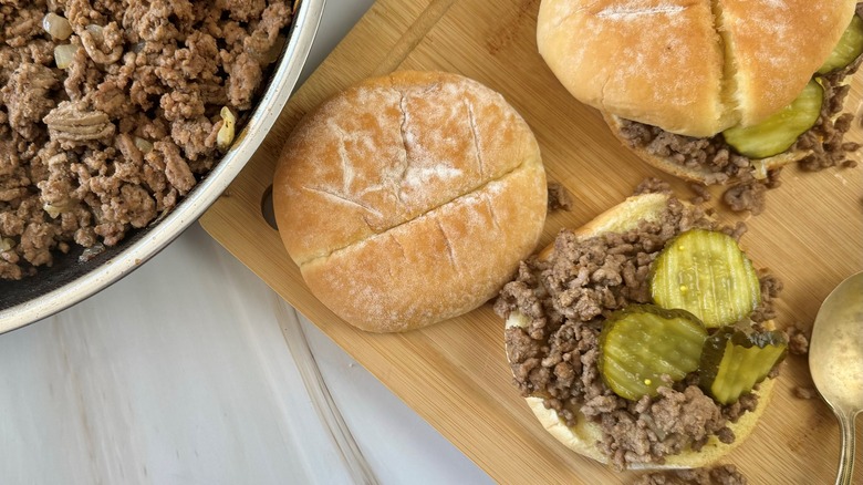 Depending on how heavily you load up the buns, you may have some ground beef mixture left over after you've assembled all the sandwiches. In fact, you might want to double the recipe to ensure you have extras after your meal. Thanks to the tasty sauces and spices in the ground beef mixture, the meat is juicy and packed with flavor, making it a perfect addition to numerous dishes. Pretty much any recipe that calls for well-seasoned ground beef will benefit from this mixture.